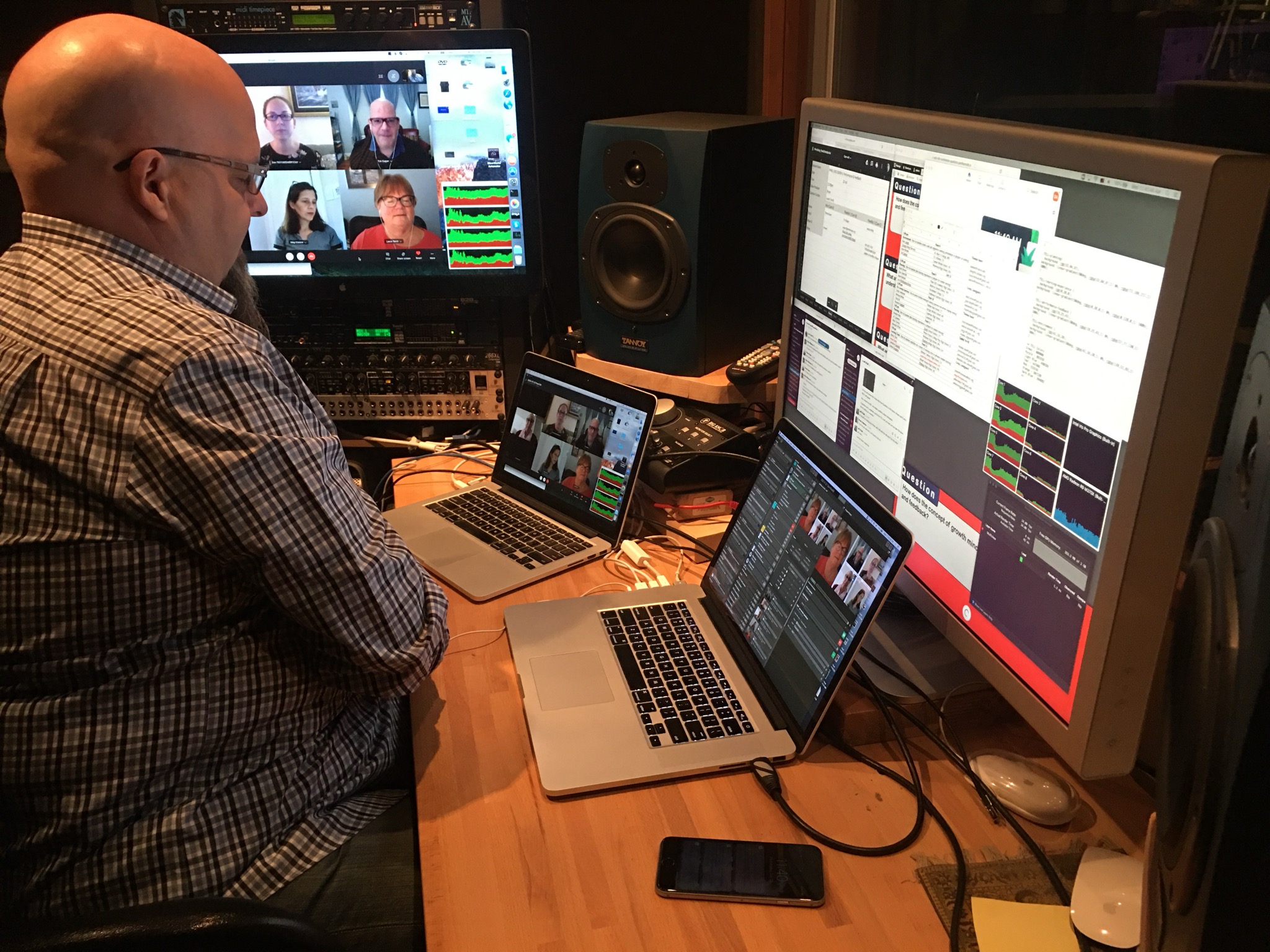 One problem I have is a lack of computing horsepower. mimoLive supports NDI, which I've been using for a couple of years at NFLC, so to spread around the compute requirements I decided to have panelists call into a Skype meeting on one laptop and another laptop running mimoLive would pull them in over NDI. That laptop would handle the switching, graphics, and live streaming. I wish I had more power available, but it worked pretty well and it looked way better than a basic Zoom call.