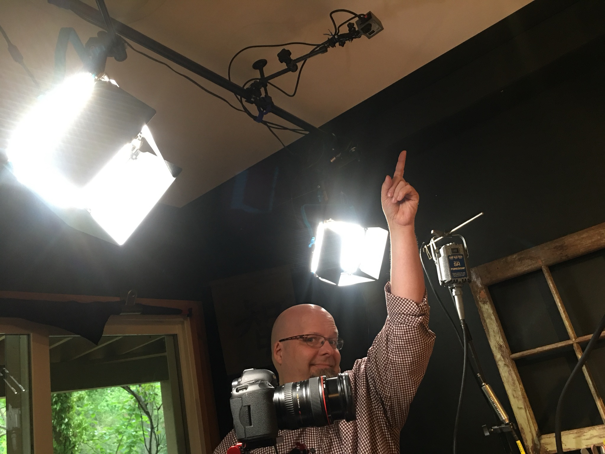 All of the tripods and light stands are a hazard. I really need a grid to mount the lights and cameras, but with Blair's business shutdown funds are tight. I found a metal curtain rod in the storage room that had never been installed, so that will have to do for now. Thankfully, LED fixtures are so light the curtain rod can handle it. I also mounted the GoPro overhead to get an angle on the bench I couldn't get before.